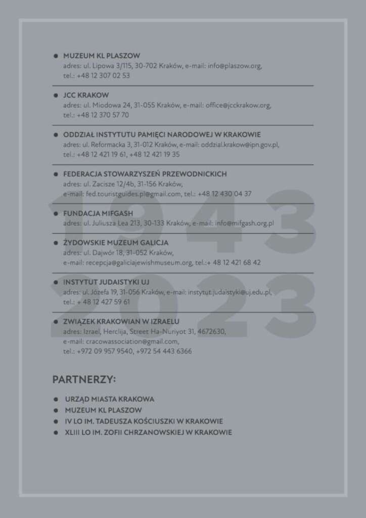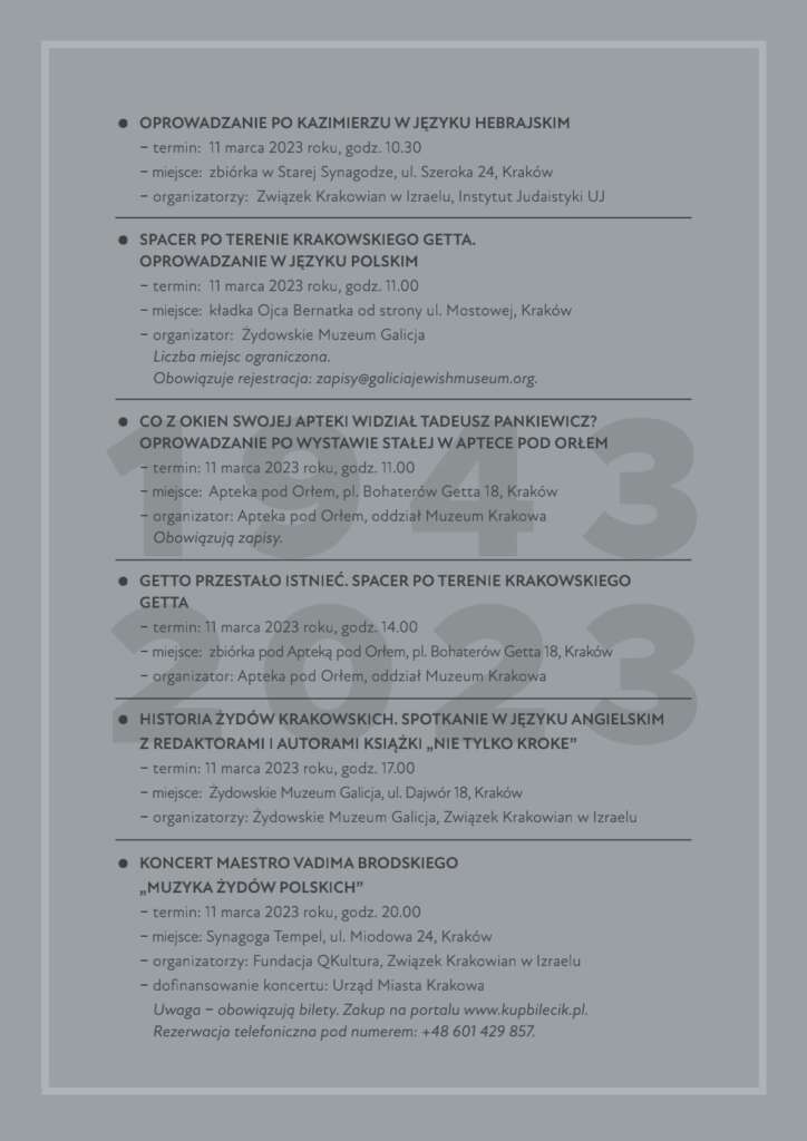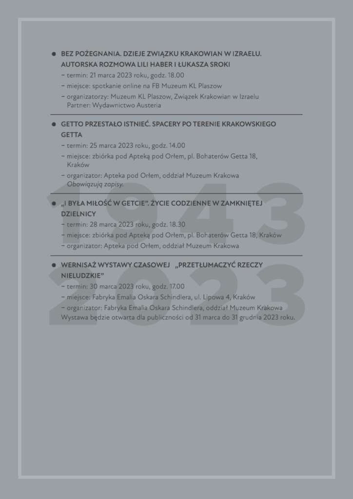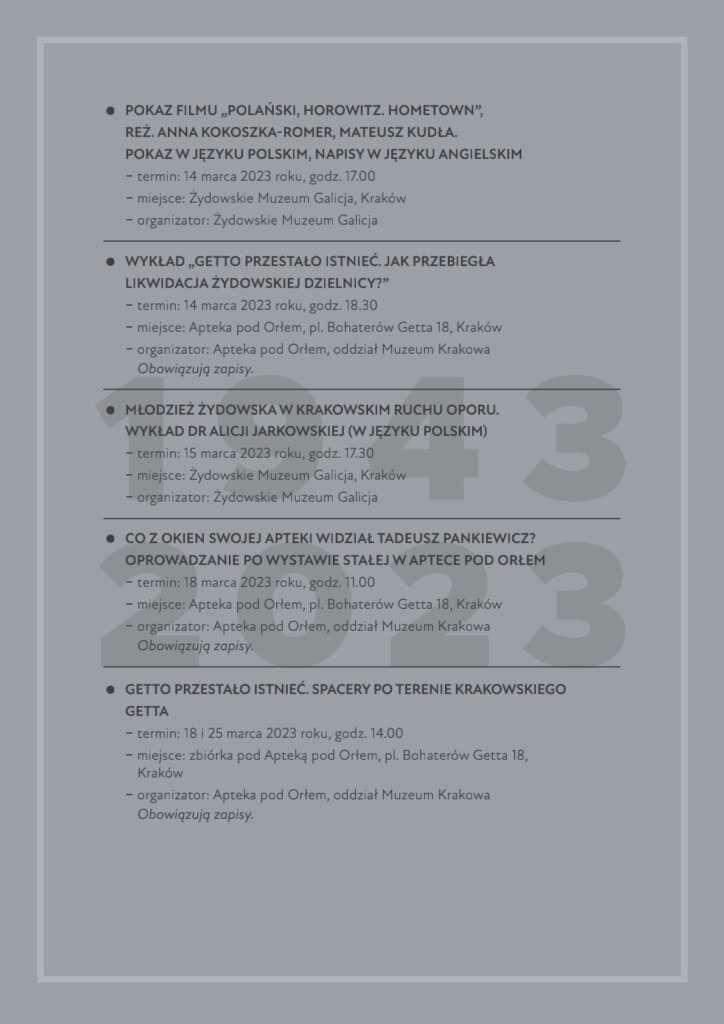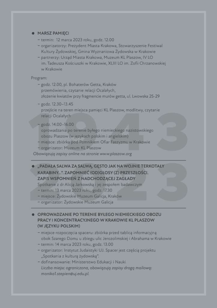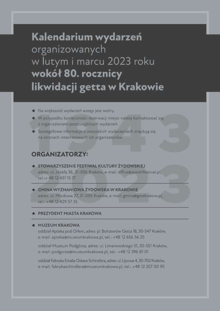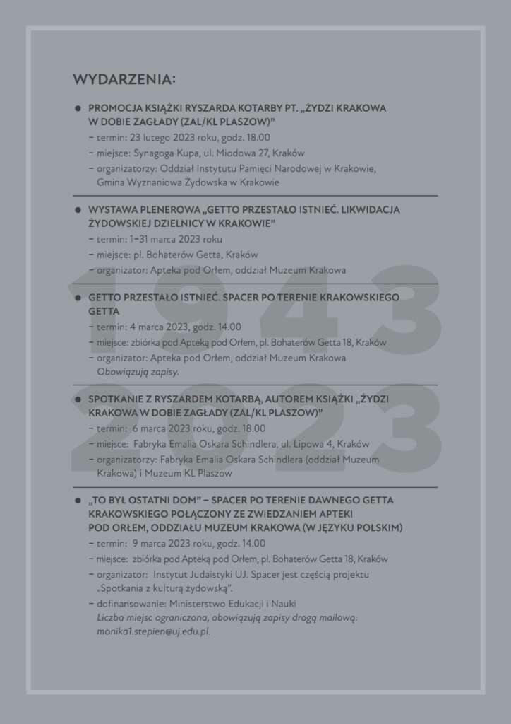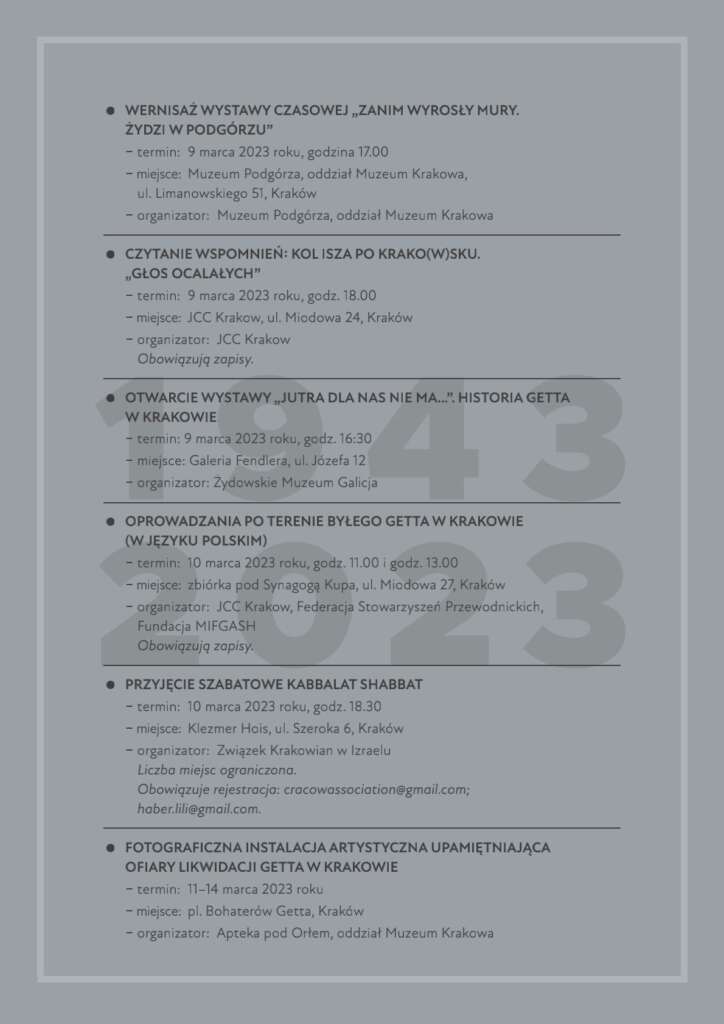 Przedstawiamy kalendarium wydarzeń organizowanych w lutym i marcu 2023 r. związanych z 80. rocznicą likwidacji getta w Krakowie.